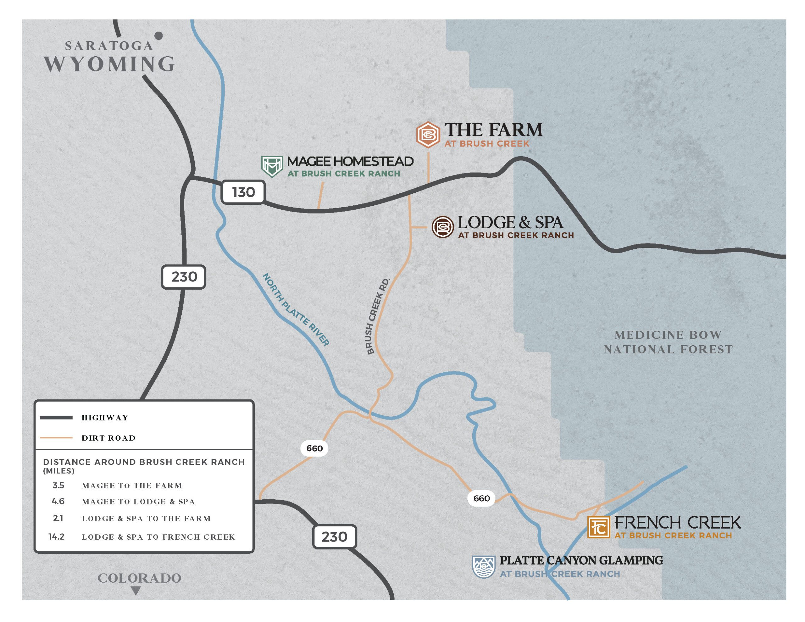 20 miles from the historic town of Saratoga in south-central Wyoming, Brush Creek Ranch is most easily reached by private air into Saratoga Jet Center, landing guests just 13 miles from our front gates. Scenic views are enjoyed along the I-80 and WY Hwy 130 driving approximately one hour from the Laramie Regional Airport or three and a half hours from Denver International Airport.